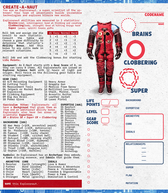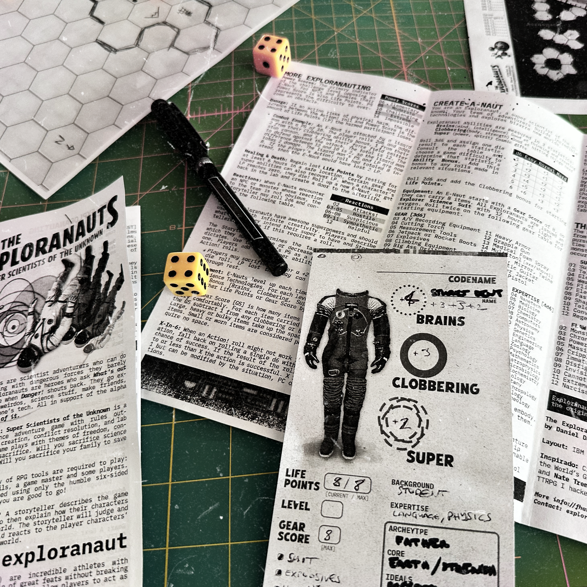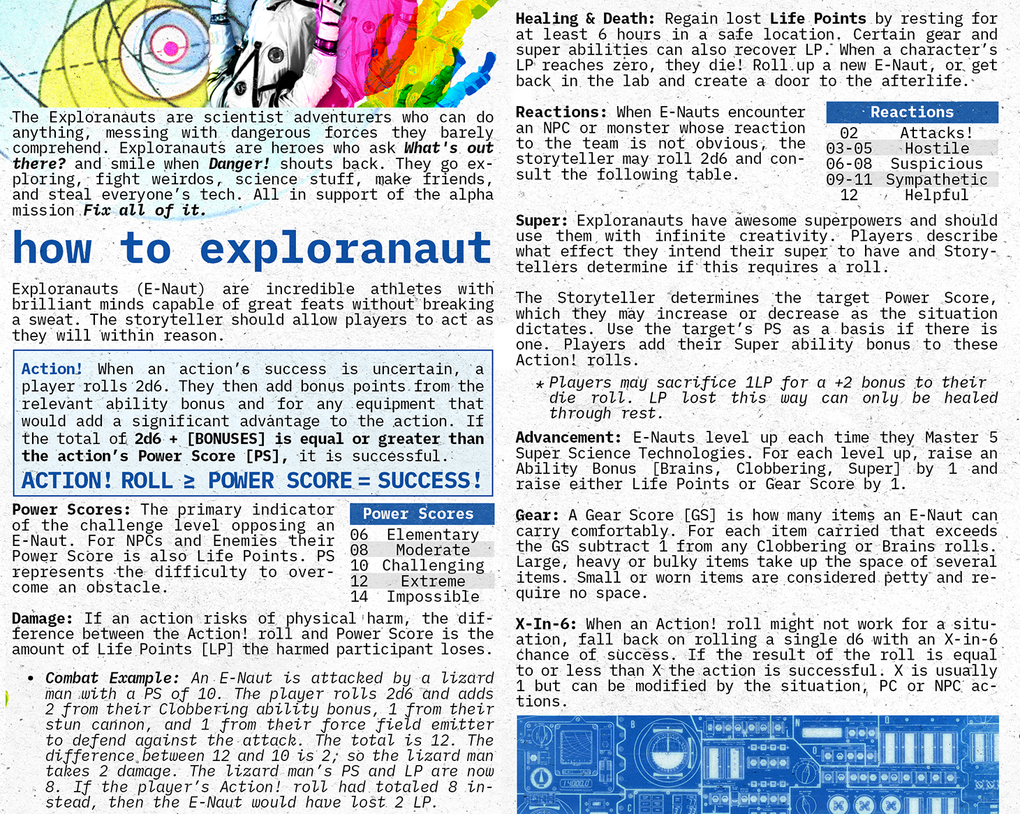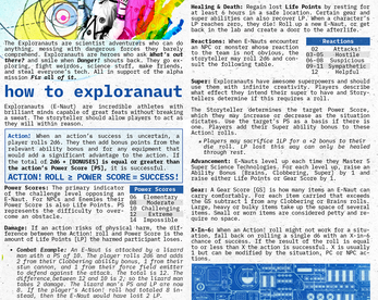 The Exploranauts: Super Scientists of the Unknown is a rules-lite science adventure game with rules outlining character creation, conflict resolution, and lab research.