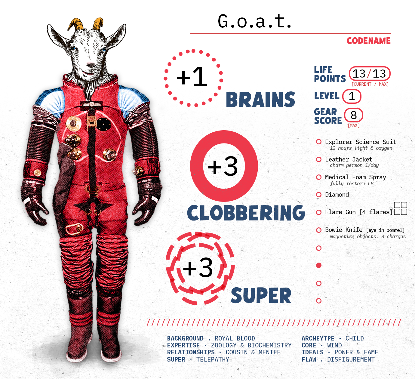 Inspirado: Credit to Jack Kirby for the World’s Greatest Comics Magazine and Nate Treme for the Tunnel Goons TTRPG system I hacked to make this game.